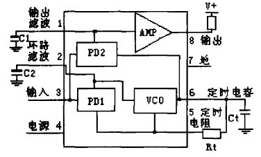 LM567为通用锁相环电路音调译码器,当LM567的③脚输入幅度≥25mV、频率在其带宽内的信号时,⑧脚由高电平变成低电平,②脚输出经频率/电压变换的调制信号;如果在器件的②脚输入音频信号,则在⑤脚输出受②脚输入调制信号调制的调频方波信号。用外接元件...