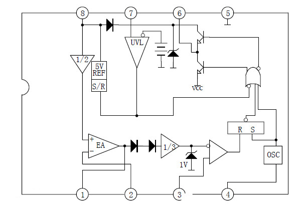 | 6 | 推挽输出端 | 内部为图腾柱式,上升、下降时间仅为50ns 驱动能力为±1A ; |